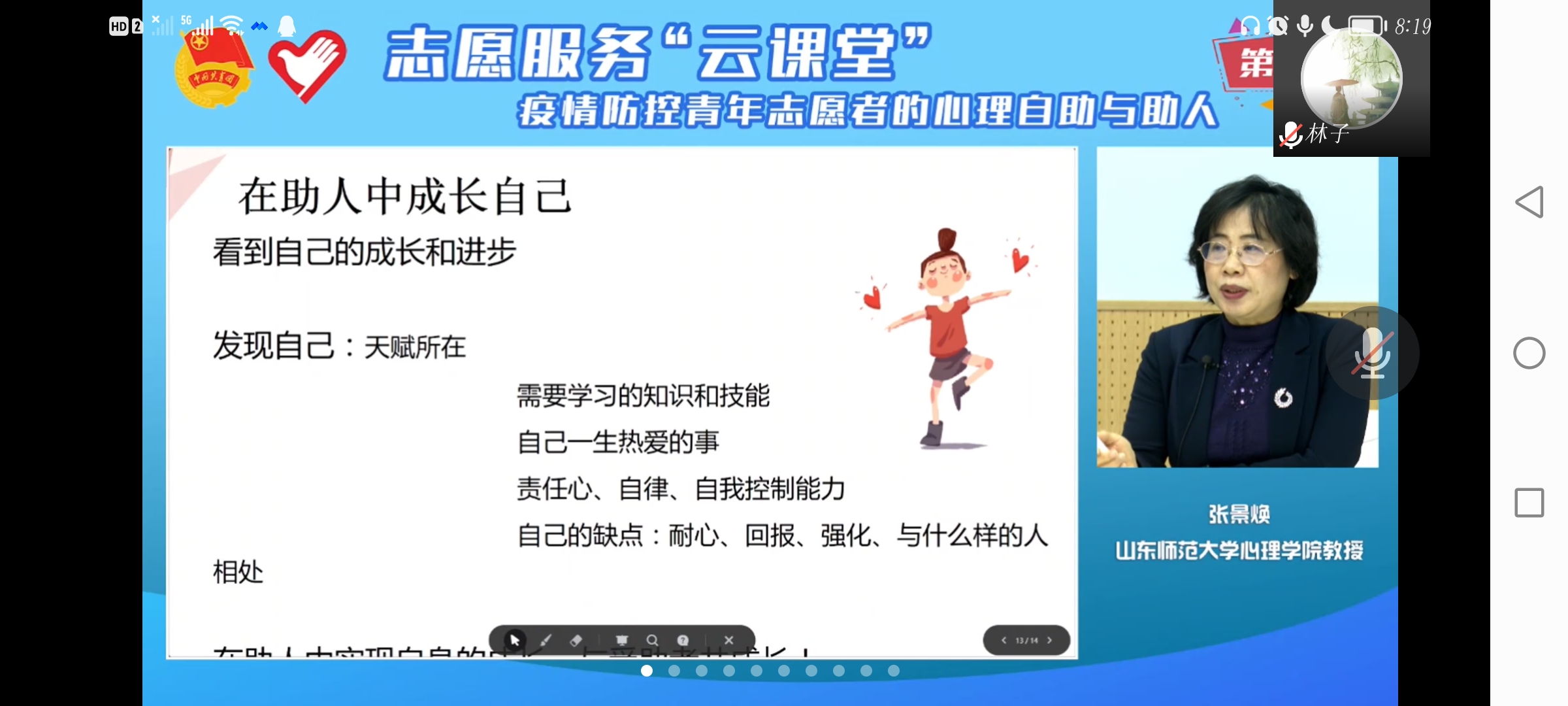 讲座伊始,张景焕用幽默风趣的话语向大家讲授了心理问题在志愿服务中的意义及重要作用,并通过列举中华慈善日及国际志愿服务日的来源、意义等,向大家强调了志愿服务对于国家、世界的重要意义,更加坚定了大家志愿服务的信心与热情,随后,张教授从志愿者的常见心理问题与调试、受助者常见心理问题及干预、在助人中成长三方面为大家耐心讲解志愿服务中心理自助的相关问题。在志愿者方面,张教授指出,志愿者在服务中无偿且持续地帮助他人,且有时会遭受质疑、发生冲突等,因此在志愿服务过程中易出现动机指向不明晰、遇到问题和挫折时易退却等问题,甚至出现焦虑、抑郁、自责等不良心理,阻碍志愿服务工作的顺利展开。针对此类问题,张教授通过“四步走”的方式,由思想到行动到价值,层层深入,直击问题根源,同时,张教授鼓励大家要完善小我,发扬大我,努力做到小我与大我的平衡,将满腔热情投入到志愿服务当中;在受助者方面,张教授通过列举部分常见的心理问题,借助疫情期间的真实案例,生动形象地为大家讲解心理问题出现后的解决方案,随后,张教授以小贴士的形式向大家展示在日常生活中如何积极有效地预防心理问题的产生,回归简单的心理预期,做到防患于未然;在成长方面,张教授指出,志愿者精神体现在每一名志愿者的身上,志愿服务是社会合作的一种最高形式,助人自助,它能够帮助志愿者挖掘受助者自身的潜力,增强责任心、自律意识及自我控制能力,它所带来的成长是由内而外的,将受益于一生。