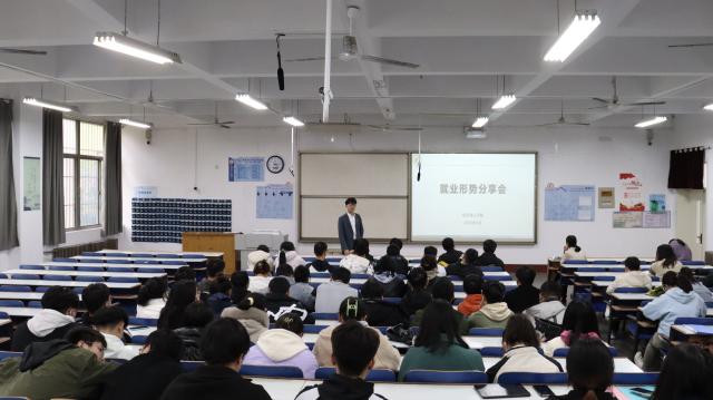 活动伊始,贾云超通过向大家展示当前就业形式相关数据的统计图表,分析了目前我国就业政策的基本导向、就业形势、就业观念以及就业方向,并与往年就业情况展开对比,帮助同学们更加直观地了解到当前的就业前景。随后,贾云超结合自己的真实经历,针对就业事务流程、毕业生权益、就业签约注意事项等同学们关注的问题进行详细地分析解答。他强调,我国当前的就业形势十分严峻,就业难度系数加大,同学们要学会自我评价、充分发挥个人优势、努力提高个人核心竞争力,并鼓励大家保持积极向上的心态,不畏惧前方的困难与考验,树立正确的人生目标,抓住机遇实现自己的人生理想。
