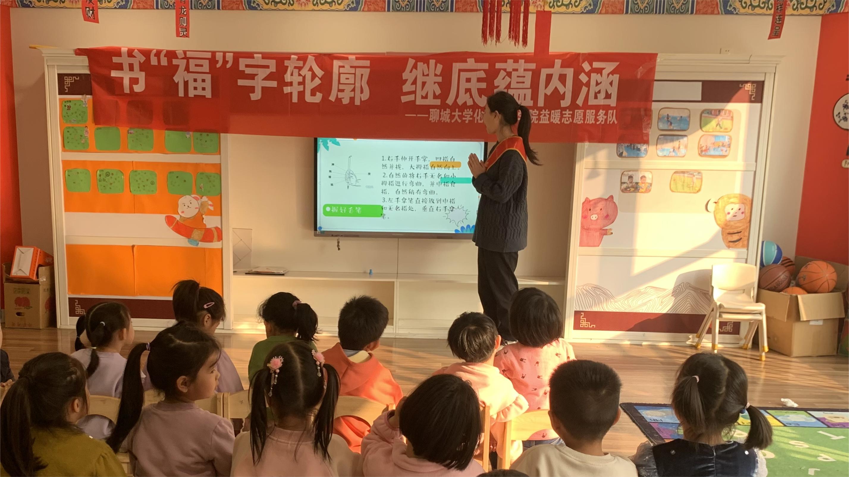 书法进课堂,文化润人心。为弘扬中华优秀传统文化,加深小朋友们对“福”字的理解,增强他们对书法文化的兴趣,1月12日,威廉希尔(WilliamHill)益暖志愿服务队于牛津国际聊城孟达幼儿园举办“书‘福’字轮廓,继底蕴内涵”志愿服务活动。