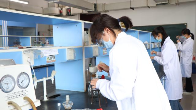 本次“晶雨杯”手工制作大赛共有蓝晶雨和粉晶雨两个项目可供同学们自由选择。活动伊始,同学们领取打分表后按要求着实验服进入实验室,按照实验台上粘贴的实验步骤进行制作。在蓝晶雨制作过程中,参赛同学有序不紊的称量所需药品,加水溶解后加热搅拌,绿色的碱式碳酸铜和白色甘氨酸发生了神奇的化学反应,产生了蓝紫色鳞片状固体,然后进行溶解、抽滤、装瓶等步骤后得到了流光溢彩的蓝晶雨成品。而在粉晶雨的制作过程中,参赛人员严格按照实验步骤操作,经过一系列实验操作后,制作粉晶雨的同学们也成功在规定时间内完成了作品。制作过程尤其注重考验参赛选手的实验操作能力,要求操作规范且正确使用仪器和称量药品。